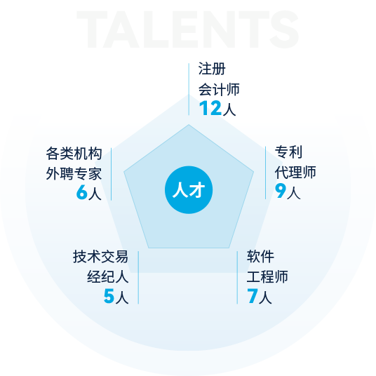 截止2024年,公司擁有各類人才400余人,其中全職博士2人,全職碩士23人,本科188人,???00余人,注冊會計師12人,專利代理師9人,軟件工程師7人,技術交易經(jīng)紀人5人,南京企服中心等各類機構(gòu)外聘專家6人,公司還和南京大學、東南大學、南京農(nóng)業(yè)大學、南京信息工程大學、南通大學、江蘇開放大學等建立了良好的合作關系。